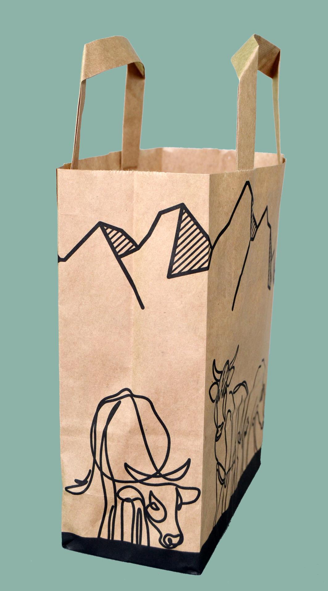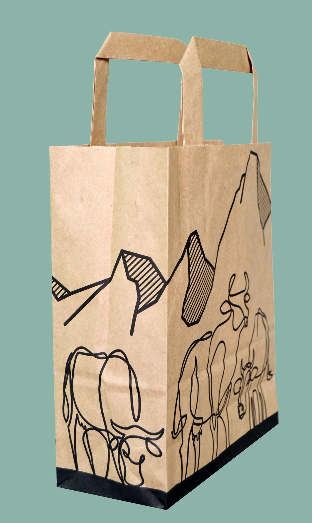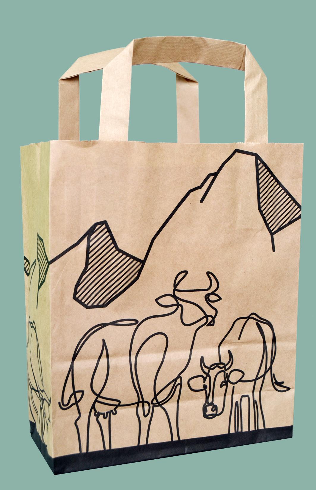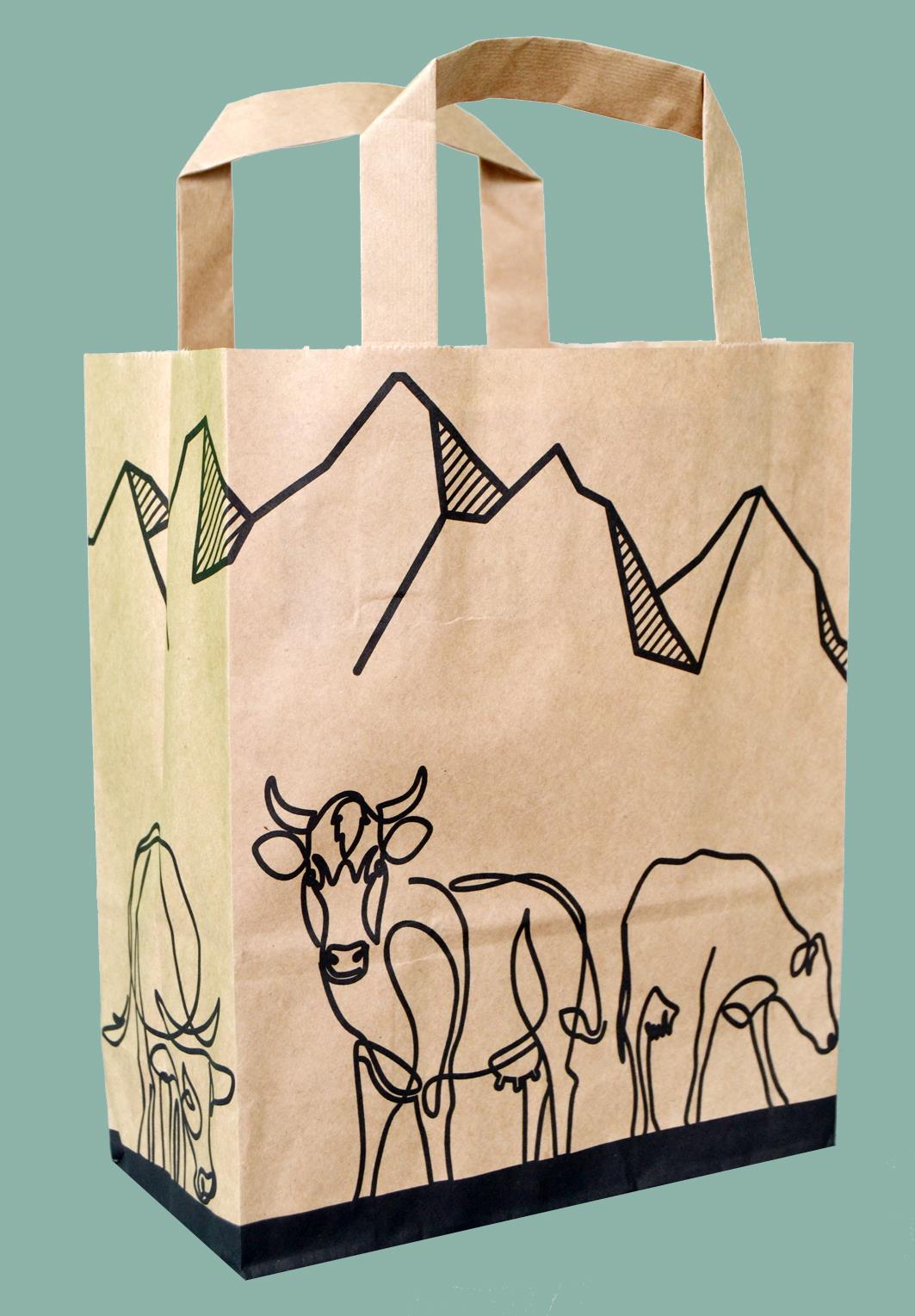 "Papier-Tragtaschen braun mit Motivdruck Kuh und Berge in diversen Grössen"